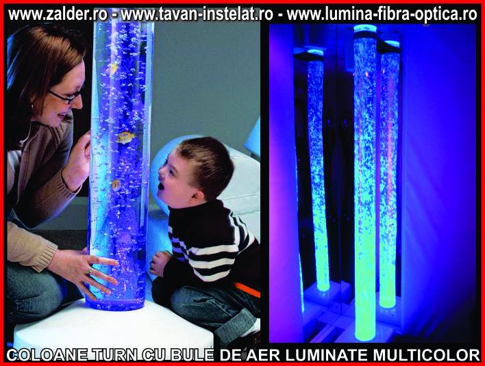COLOANA CU BULE DE AER LUMINATE - tub de plexyglass umplut cu apa in care e pompat aer. Bulele sunt luminate din cutia de la baza, cu leduri RGB telecomandabile sau cu comanda speciala cu butoane mari. Tuburile au lungimea de fabrica de 200cm